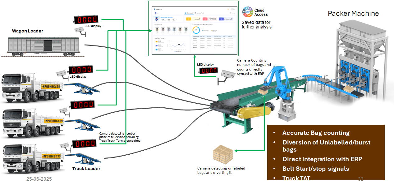 ConveyorVision uses AI-powered YOLO models and HD cameras to track, count, and verify cement bags in real time from packer to truck/wagon. Integrated with ERP, it ensures accuracy across bag types, detects unlabelled or damaged bags, captures truck numbers, and offers dashboards for TAT and equipment efficiency.
